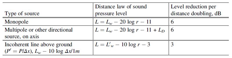 Figure 1. Free-field propagation from elementary sources in direction of maximum sound radiation