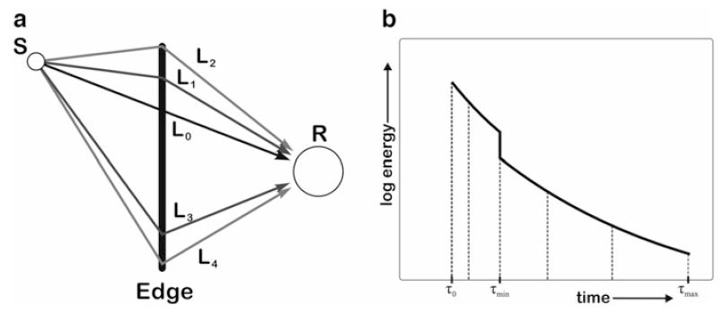 Figure. (a) Sound paths from to via an edge. describes the shortest path over the edge, the other paths have longer detours over the edge. (b) Energetic edge diffraction impulse response. is the delay of the shortest path, and describe the delays over the edge’s starting point and end point